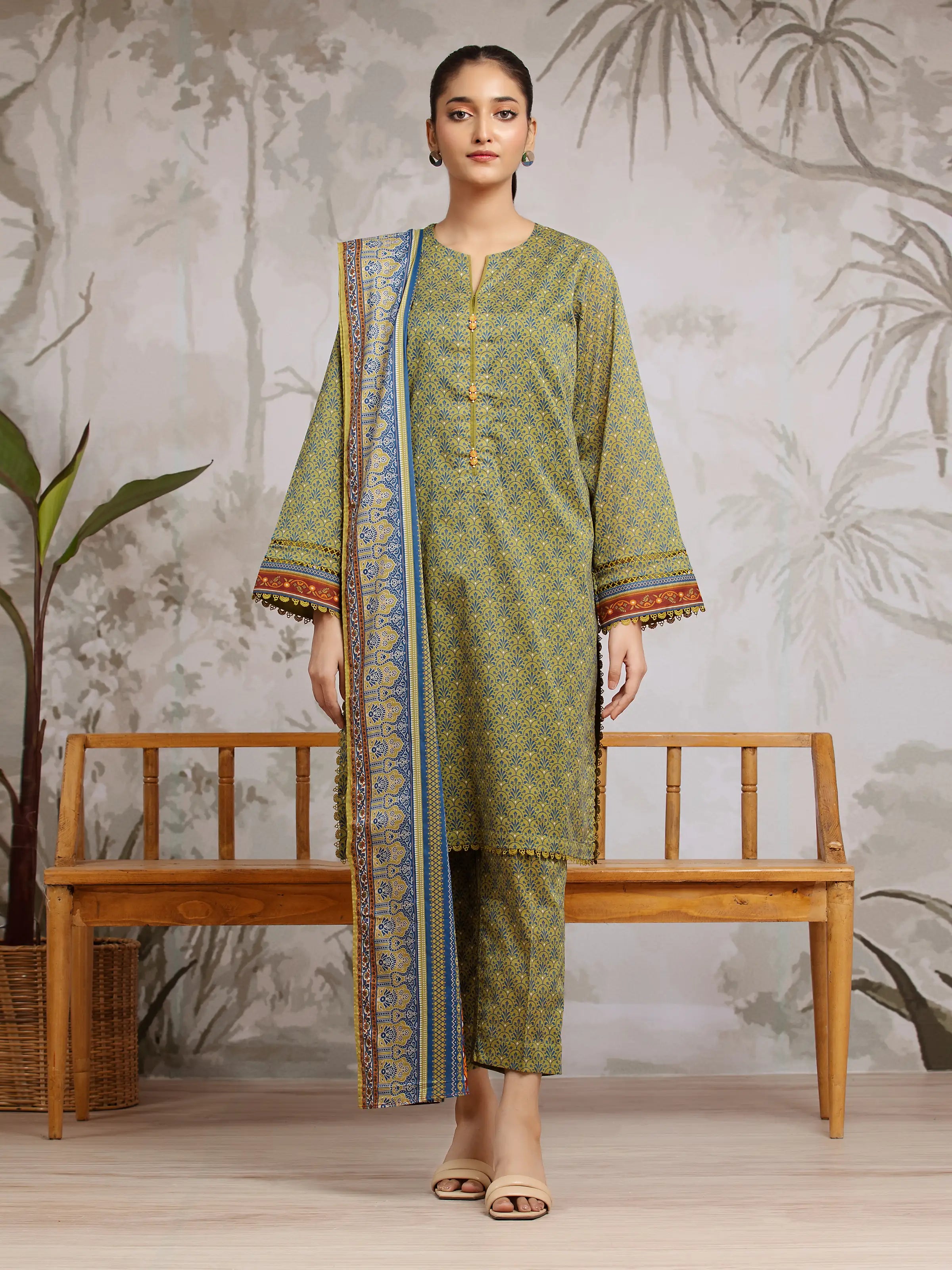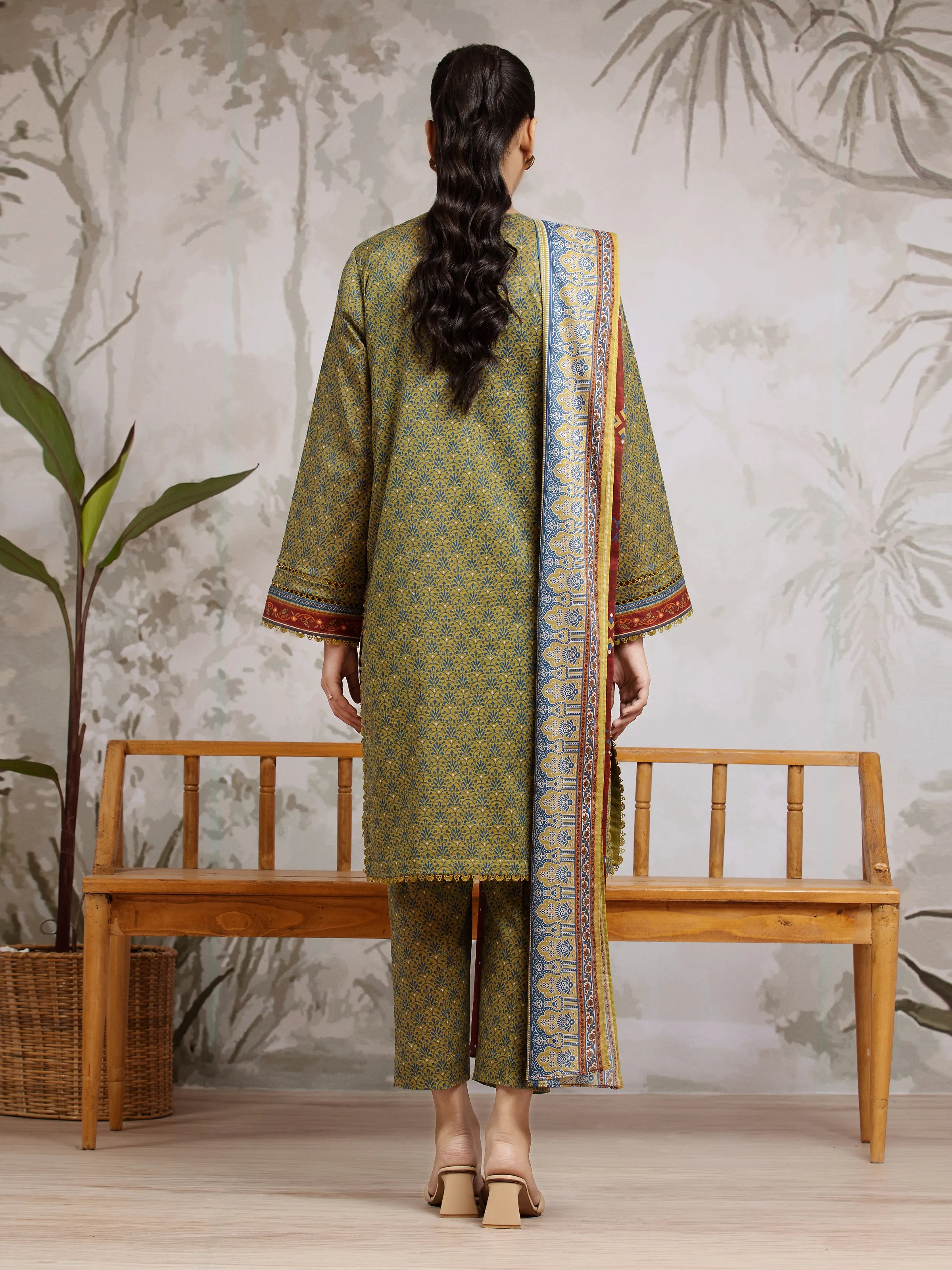 EDENROBE-29307-Unstitched Olive Green Printed Khaddar 3 Piece