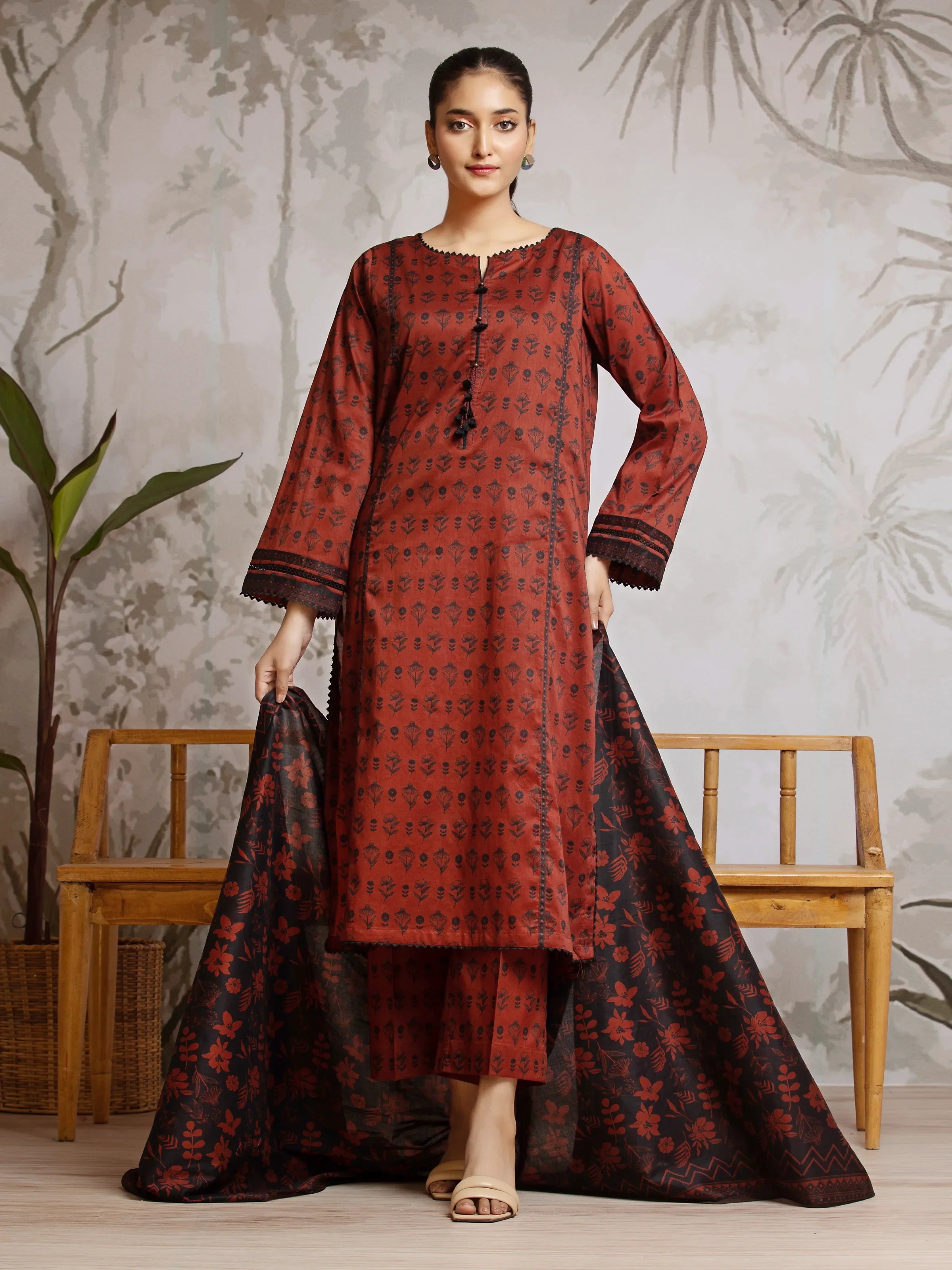 EDENROBE-29623-Unstitched Dark Maroon Printed Khaddar 3 Piece