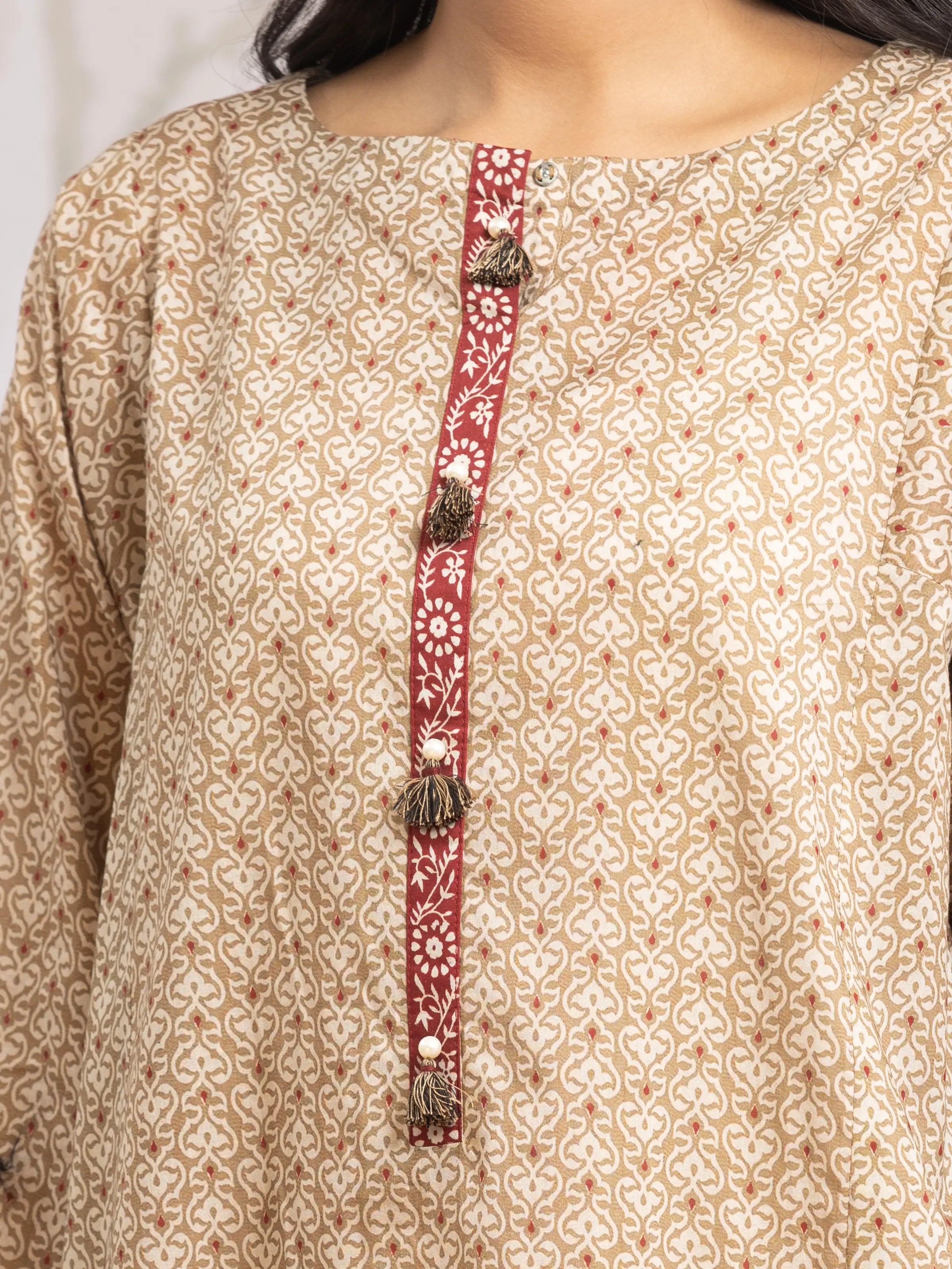 EDENROBE-Unstitched Beige Printed Khaddar 3 Piece - EWU24M2-187